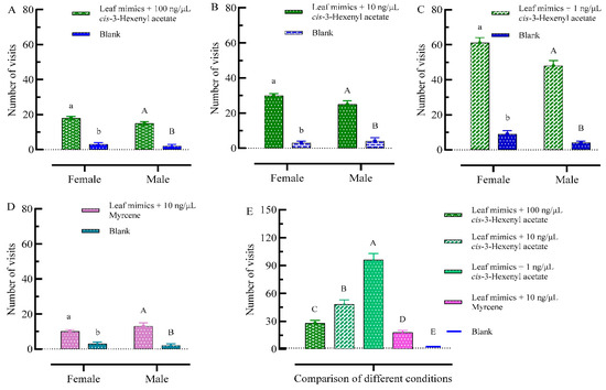 Comparison of numbers of adult visits to models + VOCs with single leaf mimics. (A) Comparison of numbers of adult visits to mimics + 100 ng/μL cis-3-hexenyl acetate with single model. (B) Comparison of numbers of adult visits to mimics + 10 ng/μL cis-3-hexenyl acetate with single model. (C) Comparison of numbers of adult visits to mimics + 1 ng/μL cis-3-hexenyl acetate with single model. (D) Comparison of numbers of adult visits to mimics + 10 ng/μL myrcene with single model. (E) Comparison of the total numbers of adult visits to five different conditions. Histograms are expressed as mean ± SD. Differences in the numbers of adult visits (p < 0.05) were determined by one-way ANOVA. Post hoc test is used with LSD. Lowercase letters indicate significant differences in female visits to mimics (Figure 6A–D). Uppercase letters indicate significant differences in male visits to mimics (Figure 6A–D). Uppercase letters indicate significant differences in adult visits to five different conditions (Figure 6E).
