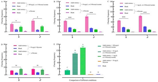 Comparison of numbers of adult visits to adult mimics + VOCs. (A) Comparison of the numbers of adult chases to adult mimics + 100 ng/μL cis-3-hexenyl acetate with blank + n-hexane. (B) Comparison of the numbers of adult chases to adult mimics + 10 ng/μL cis-3-hexenyl acetate with blank + n-hexane. (C) Comparison of the numbers of adult chases to adult mimics + 1 ng/μL cis-3-hexenyl acetate with blank + n-hexane. (D) Comparison of the numbers of adult chases to adult mimics + 10 ng/μL myrcene with blank + n-hexane. (E) Comparison of the numbers of adult chases to adult mimics with blank. Histograms are expressed as mean ± SD. One-way ANOVA was used to determine differences in the numbers of adult chases (p < 0.05). Post hoc test is used by LSD. * indicates significant differences in the frequency of adult chases. ***: p < 0.001. ns indicates no significant differences in the frequency of adult chases. Capital letters indicate significant differences in adult visits in five different conditions (Figure 7E).