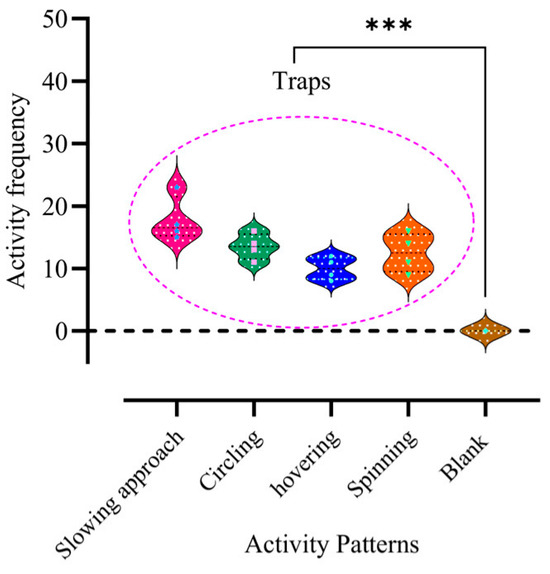 Activity frequency of male and female adults near bucket traps compared with the control. Chi-squared test was used to determine differences in the number of adult activity patterns (p < 0.05). ***: p < 0.001.