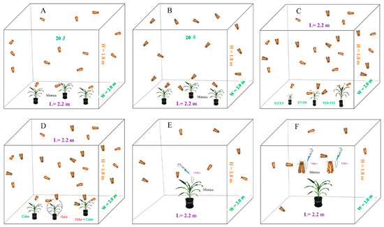 Schematic diagram of the equipment associated with the adult attraction test. (A) Vision test for male adult visiting single color. (B) Vision test for female adult visiting single color. (C) Adults visiting three different stages of maize plant attraction tests. (D) Adults visiting three different condition attraction tests. (E) Adult visiting maize plant mimics + VOCs tests. (F) Adults visiting adult mimics + VOCs attraction tests.