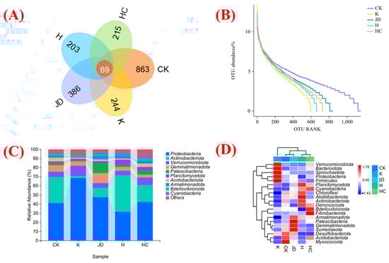 Bacterial OTU Wayne plot (A), bacterial abundance curves (B), root soil microbial community composition at the bacterial phylum level (C), and species composition plot at the bacterial phylum level (D) in the root soil of tall fescue under bacterial addition treatments. CK indicates the blank treatment; K indicates the Bacillus subtilis application; JD indicates the Bacillus amyloliquefaciens application; H indicates the Aspergillus niger application; and HC indicates the Trichoderma harzianum application.