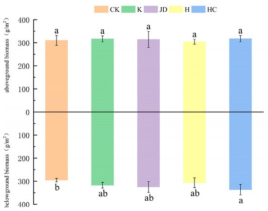 Aboveground and belowground biomasses of tall fescue under the added microbial liquid treatments. Note: Different lowercase letters represent significant differences among the different treatments for the same index (p < 0.05). CK indicates the blank treatment; K indicates the Bacillus subtilis application; JD indicates the Bacillus amyloliquefaciens application; H indicates the Aspergillus niger application; and HC indicates the Trichoderma harzianum application.