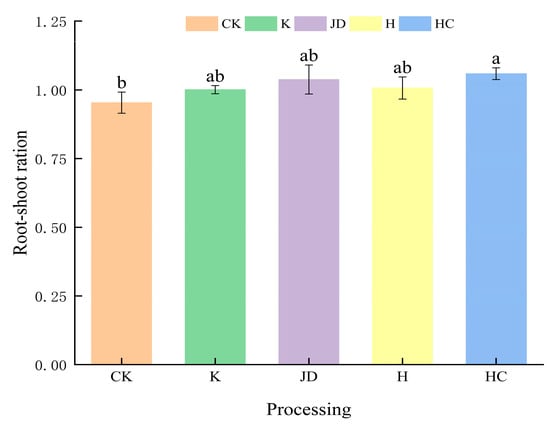 Root–shoot ratio of tall fescue under the added microbial liquid treatments. Note: Different lowercase letters represent significant differences among the different treatments for the same index (p < 0.05). CK indicates the blank treatment; K indicates the Bacillus subtilis application; JD indicates the Bacillus amyloliquefaciens application; H indicates the Aspergillus niger application; and HC indicates the Trichoderma harzianum application.