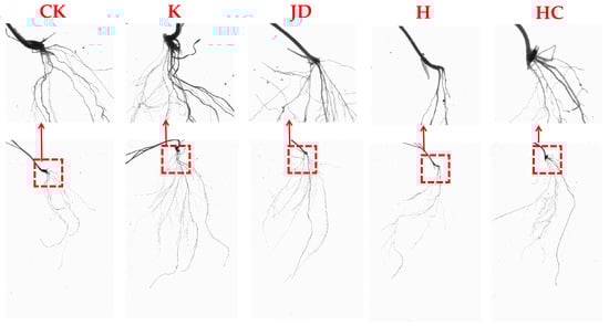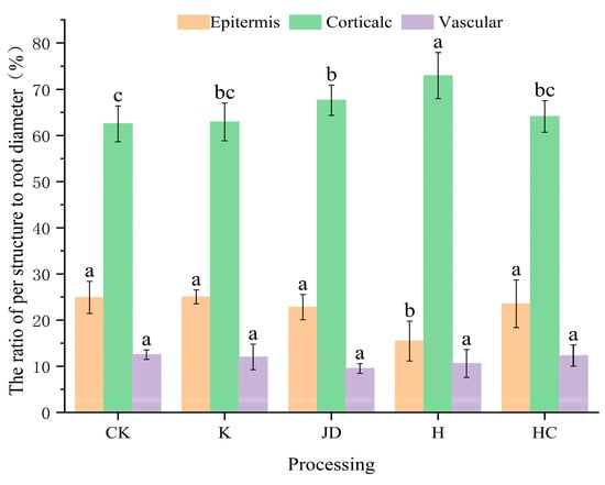In conclusion, the root transverse areas under each treatment were in the order HC > K > H > JD > CK; the percentages of epidermis were in the order K > CK > HC > JD > H; the percentages of cortex were in the order H > JD > K > HC > CK; and the percentages of endodermis were in the order CK > HC > K > H > JD.