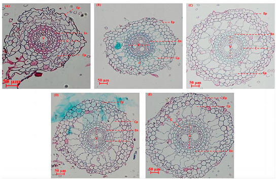 The transverse anatomical structure of the primary root of tall fescue after the addition of microbial liquid treatments. Note: (A) blank treatment; (B) application of Bacillus subtilis; (C) application of Bacillus amyloliquefaciens; (D) application of Aspergillus niger; and (E) application of Trichoderma harzianum. Ep: epidermis; Cp: cortical parenchyma; En: endodermis; C: cortex; V: vascular.