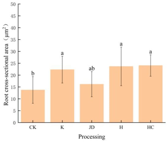 The main root cross-sectional area was (13.76 ± 5.72) × 104 µm2 in the non-microbial liquid treatment group, while the lower root cross-sectional area was (22.32 ± 5.65) × 104 µm2 in the K-treated group, (16.16 ± 5.30) × 104 µm2 in the JD-treated group, (20.63 ± 9.83) × 104 µm2 in the H-treated group, and (24.05 ± 4.51) × 104 µm2 in the H-treated group. No significant difference was observed in root cross-sectional area between the control group and the Bacillus amyloliquefaciens treatment group. However, the CK treatment showed significant differences compared to all the other microbial treatment groups (p < 0.05) (Figure 7).