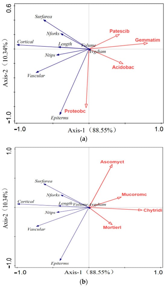 RDA analysis. (a) RDA analysis of the tall fescue root indicators and bacterial phyla. (b) RDA analysis of the tall fescue root indicators and fungal phyla.