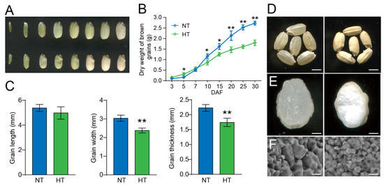 - Park, J.R.; Kim, E.G.; Jang, Y.H.; Kim, K.M. Screening and identification of genes affecting grain quality and spikelet fertility during high-temperature treatment in grain filling stage of rice. BMC Plant Biol. 2021, 21, 263. [Google Scholar] [CrossRef]