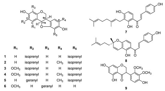 1H-1H COSY of the isolated compounds 1–8 indicated the presence of an isoprenyl group and a main skeleton in each compound. The positions of the isoprenyl groups and quaternary carbons in each compound were identified by performing a 1H-13C HMBC experiment, which shows long-range connectivity between protons and carbons. The coupling constant between H-6a and H-11a [J = 6.4 Hz, indicating an axial–equatorial arrangement] agreed with the finding that pterocarpans are found in nature only in the 6a, 11a-cis configuration []. The absolute configuration of the pterocarpan at C-6a was assigned as R based on its negative optical rotation and positive Cotton effect [,] at 285 nm (additional information). For example, the most potent pterocarpan, pterocarpan 6, showed an [α] = −122 (c 0.21, MeOH) + 20.8 (at 286 nm) Cotton effect. By comparing the physical and spectral data of these isolated polyphenols with those of known compounds, we identified the nine isolated species as erythrabyssin II (1), lespebuergine G4 (2), 1-methoxyerhtrabyssin II (3), bicolosin A (4), bicolosin B (5), bicolosin C (6), xanthoangelol (7), (±)-lsepeol (8), and parvisoflavanone (9).