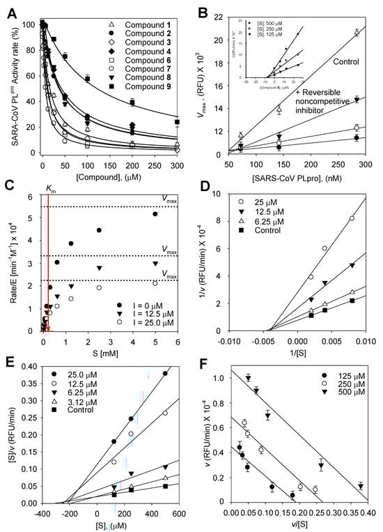 All the inhibitors exhibited a similar relationship with enzyme activity and concentration. The inhibition of SARS-CoV PLpro activity by 6, the most potent pterocarpan (Ki = 9.06 μM), is shown in Figure 2. An increase in the concentration of inhibitors resulted in a reduction in the residual enzyme activity. Plots of residual enzyme activity versus enzyme concentration at different concentrations of compound 6 showed several straight lines with a y-intercept of 0, indicating that 6 is a reversible inhibitor of SARS-CoV PLpro. The Lineweaver–Burk, Dixon, Hanse–Woolf, and Woolf–Hofstee plots obtained from the kinetic data in the presence of 6 indicated the noncompetitive inhibition of SARS-CoV PLpro. For instance, compound 6 reduced the Vmax, but it exhibited no effect on the Michaelis–Menten constant (Km). The Ki values of all compounds were measured using a Dixon plot (Figure 2B insert). In a plot of [S]/v versus [S] using Equation (2), increasing the concentration of 6 resulted in several lines with a common intercept on the [S] axis but with different gradients (Figure 2E), reaffirming the noncompetitive mode of enzyme inhibition [].
