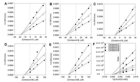 Dixon plots for the inhibition of compounds 1–4 and 8 on SARS-CoV PLpro for the hydrolysis of Z-RLRGG-AMC: compounds 1–4 (A–D), and compound 8 (E). The following substrate concentrations were used: 500 μM (▼), 250 μM (○), and 125 μM (●). (F) Slope replots: compound 1 (●), compound 2 (○), compound 3 (▼), compound 4 (△), and compound 8 (■).