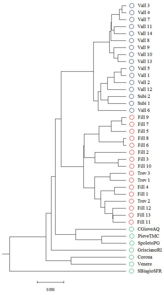 The components of genetic variability, determined through AMOVA, were analyzed for all 32 populations and for populations that were grouped based on their geographic origin (Vallepietra, Filettino, Trevi nel Lazio, and Subiaco) (Table 2). The AMOVA analysis indicated that most of the genetic variability detected by the nine SSR loci was found within populations (69%), with only 31% attributable to differences between populations (Table 2). The relatively low level of differentiation between populations is further supported by the low Fst index value (0.248) observed for the 32 populations (Table 2). Notably, the Fst value determined for the populations grouped by the four municipalities where Fagiolone is cultivated was lower than that determined for all 32 populations, and the same trend was observed for genetic variability between populations. This was determined by AMOVA (Table 2).