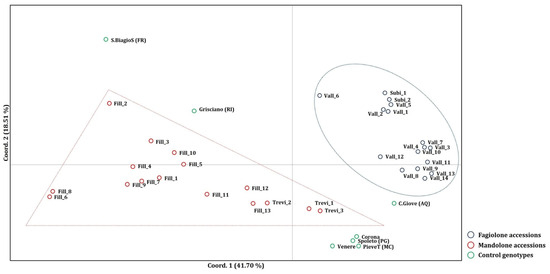 These findings are further supported by Principal Coordinates Analysis (PCoA) and the determination of pairwise Fst values for each population collected in the Aniene Valley (Figure 2 and Table S5). Specifically, the PCoA indicates that the first two components represent 60.21% of the total variation, with the first component explaining 41.70% and the second 18.51%. The PCoA clearly demonstrates a well-defined cluster for the Fagiolone accessions and a more dispersed distribution for the Mandolone accessions. Both clusters are distinct from the seven control genotypes, which are scattered throughout the plot (Figure 2).