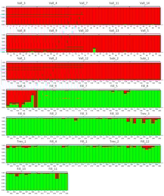 The genetic structure of the P. coccineus germplasm in the Aniene Valley was analyzed using STRUCTURE v. 2.3.4 software. This allowed for the identification of the most probable number of genetic groups in the 32 populations, the assignment of each of the 320 genotypes to the identified genetic groups, and the identification of genotypes of mixed origin. The analysis indicated that the 320 genotypes can be divided into two genetic groups (K = 2) (Figure S2), which is consistent with the two main clusters obtained through UPGMA (Figure 1). The first genetic group (red) includes 157 of the 160 genotypes related to the 14 accessions collected in Vallepietra, as well as the 2 collected in Subiaco, belonging to the Fagiolone landraces (Figure 3). Three genotypes of the accession Vall_6 (numbers 157, 158, and 159 in Figure 3) can be considered genotypes of mixed origin. This likely results from hybridization events that occur between the two genetic groups, as they have membership probability values Q < 0.75 (Table S6). The second genetic group (green) includes 156 out of the 160 genotypes related to the 13 accessions collected in Filettino, and the 3 accessions collected in Trevi nel Lazio, belonging to the Mandolone landrace. Four genotypes, three from the Trev_3 accession (numbers 242, 245, and 248 in Figure 3) and one from the Fill_11 accession (number 317 in Figure 3), can be considered putative hybrids of the two genetic groups as they also have a Q < 0.75 (Table S6). The seven genotypes of mixed origin were excluded from subsequent analyses of genetic diversity between the two groups.