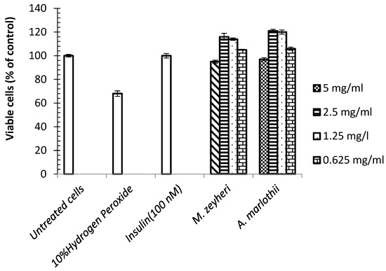 The in vitro cytotoxic effects of the crude M. zeyheri and A. marlothii water extracts were evaluated on muscle cells using the 3-(4,5-dimethyl-2-Thiazyl)-2,5-diphenyl-2H-tetrazoluim bromide (MTT) assay [66]. About 1.0 × 105 muscle cells/well were seeded into a 96-well plate and incubated for 72 h at 37 °C in a 5% CO2 humidified incubator. Thereafter, cells were treated with 100 µL of specific water extracts to achieve concentrations of 0.625, 1.25, 2.5 and 5 mg/mL. Hydrogen peroxide (10% v/v) was used as a positive control. The cells were then incubated for 48 h at 37 °C in a 5% CO2 atmosphere. Then, 10 μL MTT (5 mg/mL in phosphate-buffered saline, pH 7.2) was added to the wells and the plates incubated for a further 4 h at 37 °C for MTT reduction, followed by washing in PBS (pH 7.2). Thereafter, the formazan crystals were dissolved in DMSO, and absorbance was read at 570 nm using a microplate reader spectrophotometer (ThermoFisher Scientific, Johannesburg, South Africa). Untreated cells were used as a negative control. The percentage (%) cell viability was calculated using the equation below and expressed as % of negative controls: