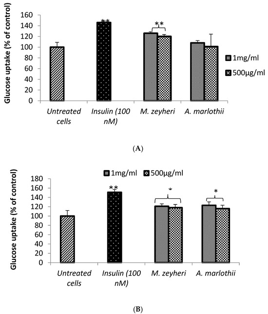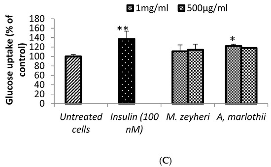 Skeletal muscle is a tissue where most glucose is absorbed and disposed [34]. In this study, the effects of A. marlothii and M. zeyheri water extracts on glucose uptake in muscle cells (C2C12) was assessed. However, with the exception of L6 cells, previous studies have reported minimal insulin-dependent glucose uptake and GLUT-4 translocation in muscle cells [35]. As shown in Figure 2A, it was revealed that 1 h exposure of cells to the aqueous extract of M. zeyheri 500 μg/mL and 1 mg/mL M. zeyheri extracts demonstrated a significant increase in glucose absorption by 20% and 26% higher than untreated controls, respectively (p < 0.001). A. marlothii treatment led to a marginal increase (1% and 8%) higher than untreated control cells for 500 μg/mL and 1 mg/mL, respectively (p < 0.001). Unsurprisingly, insulin on the other hand, appeared to stimulate an increase in glucose consumption by the cells to up to 41% higher than untreated controls after 1-h incubation (p < 0.001). The glucose absorption assessment carried out in this study is supported by the study which investigated the effect of four plant extracts (Euclea undulata, Schkuhria pinnata, Pteronia divaricata and Elaeodendron transvaalense) used traditionally in South Africa to treat and manage diabetes on C2C12 cells [36]. We found that M. zeheyri and A. marlothii extracts had the capacity to stimulate an increase of 26% and 8% glucose uptake, at 1 mg/mL after 1-h incubation, respectively, comparable to the hypoglycaemic activity of 162.2% and 107.5% exhibited by Euclea undulata and Schkuhria pinnata extract at 1-h incubation, respectively. Other plant species led to minute effect on glucose uptake by cells at the same concentration after 1-h incubation. Moreover, another study [37] on Karanjin isolated from Pongamia pinnata extracts demonstrated a significant stimulation of glucose uptake in L6 cells in a concentration-dependent manner, reaching a 1.9-fold increase at 25 µM after 16-h incubation. Insulin (100 nM), on the other hand, added 20 min prior to the glucose uptake assay, resulted in a 2-fold increase in glucose uptake compared to the basal state in L6 cells. High activity observed in the treatment with insulin for 20 min was suggested to be due to the 100 nM used coupled with the type of muscle cells [37].