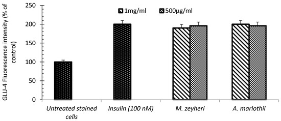 Increased glucose uptake in skeletal muscles is attributed to the increase in cell surface concentration of GLUT-4 [43]. Consequently, this study investigated whether the antidiabetic effect of the selected plant species was due to the translocation of GLUT-4. As expected, treatment with 100 nM of insulin led to a 2-fold increase in the translocation of GLUT-4, as measured using flow cytometry. Treatment of cells with 1 mg/mL of M. zeyheri and A. marlothii extracts led to 2-fold and 1.9-fold increase in GLUT-4 translocation, respectively, compared to the untreated controls (stained). Similarly, treatment of cells with extracts of A. marlothii and M. zeyheri, at 500 μg/mL led to a 1.96-fold increase of GLUT-4 translocation with respect to untreated cells (stained) (Figure 3). The present results led to the suggestion that glucose uptake primarily depends on GLUT-4 translocation, and that the hypoglycaemic activity of plant extracts and the amount of GLUT-4 translocated are connected [44]. This study is in line with work conducted elsewhere [45], which reported that 4-hydroxypipecoic acid (4-HPA), isolated from Peganum harmala, enhanced translocation of GLUT-4 in a skeletal muscle cell model, in a time- and dose-dependent manner. Furthermore, karanjin (10 µM) from Pongamia pinnata induced up to a 50% increase in GLUT-4 translocation in L6 myotubes [37]. Based on the observed glucose uptake results, this study suggests that an increase in glucose uptake may be attributed to an increase in translocation of GLUT-4 from the intracellular storage pool to the cell membranes [43].