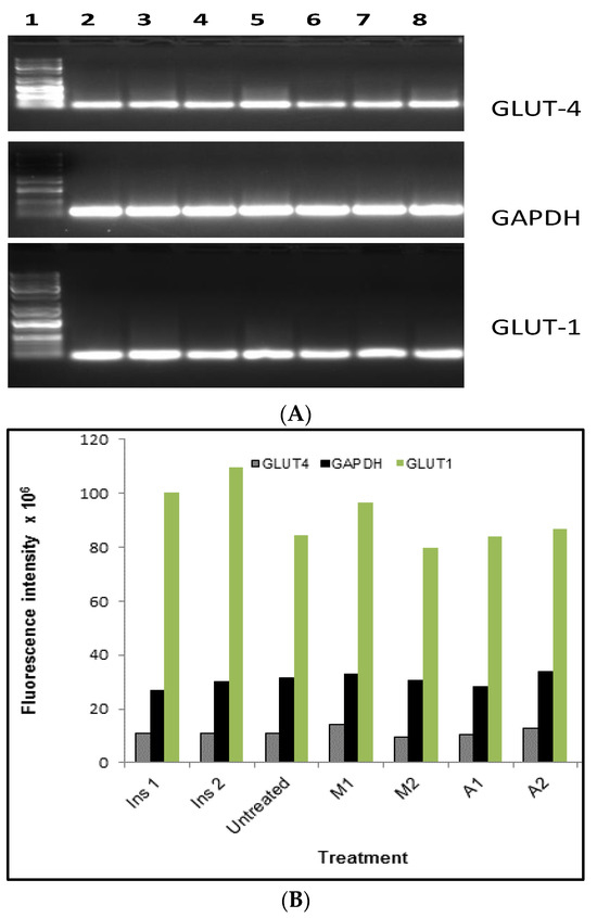 (A) RT-PCR product of GLUT-1, GLUT-4 and GAPDH visualized in agarose gel electrophoresis and (B) densitometric quantification of the mRNA levels. Ins 1 and 2 = Insulin (100 nM and 50 nM), Untreated = Untreated cells, M1 and M2 = Mimusops zeyheri (500 μg/mL and 1 mg/mL), A1 and A2 = Aloe marlothii (500 μg/mL and 1 mg/mL). Agarose gel lanes: 1, MW markers, 2; 100 nM Insulin; 3, 50 nM insulin; 4, untreated cells; 5, 500 μg/mL M. zeyheri; 6; 1 mg/mL M. zeyheri; 7, 500 μg/mL A. marlothii; 8, 1 mg/mL A. marlothii.