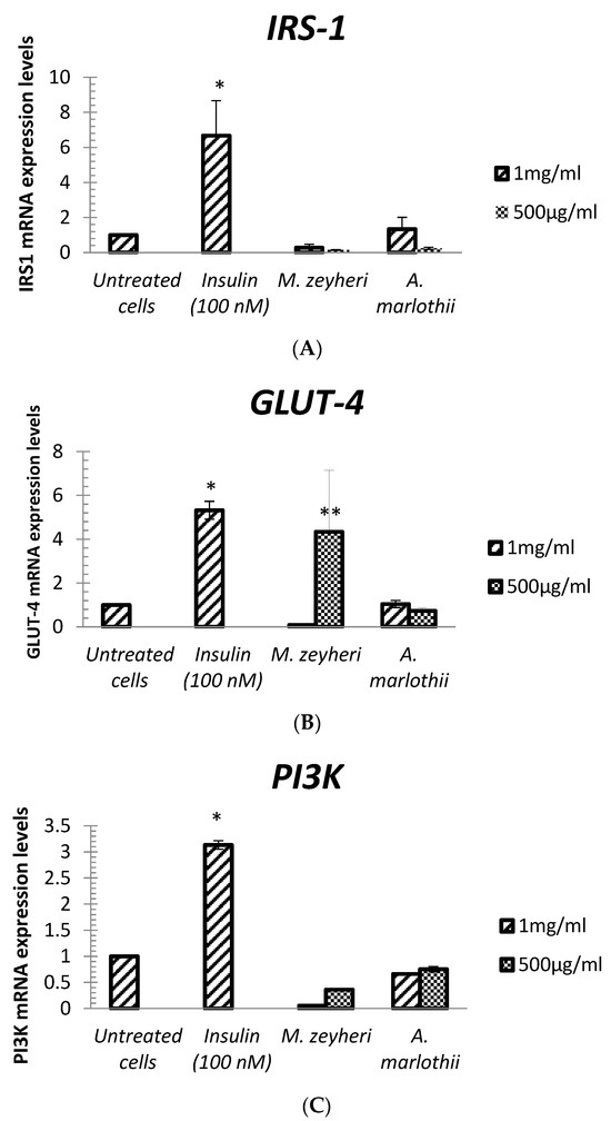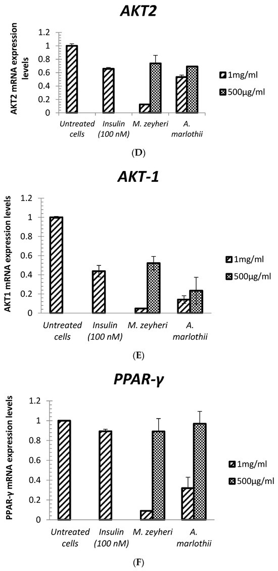 A quantitative real-time polymerase chain reaction (RT-qPCR) method was used to quantify mRNA levels of key genes involved in the insulin signalling pathway and glucose utilisation, and the results are presented in Figure 5. The results of this study show the potential of insulin to increase the expression of GLUT-4 mRNA significantly, while A. marlothii did not affect the expression of this gene (p < 0.05). The lower concentration (500 μg/mL) of M. zeyheri led to a 4-fold improvement in the expression of GLUT-4 in comparison to the untreated control. Furthermore, the results obtained show that the extracts of both A. marlothii and M. zeyheri did not have any effect on the expression of insulin receptor substrate 1 (IRS-1), phosphoinositide 3- kinase (PI3K), protein kinase B (Akt/PKB) and peroxisome proliferator–activated receptor γ (PPAR-γ) at all concentrations used. Treatment of cells with extracts and insulin appeared to downregulate the expression of Akt-1 and Akt-2, when compared to the expression in control untreated cells. However, insulin upregulated the expression of PI3-K and IRS-1 genes.