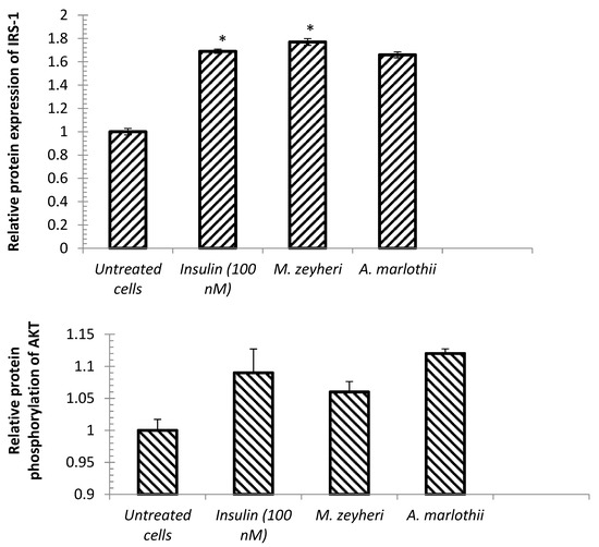 Effects of M. zeyheri Sond. and A. marlothii A.Berger extracts on IRS-1 protein expression levels and Akt phosphorylation in C2C12. Data are mean ± SEM of three independent experiments performed in triplicates (n = 9). Results are expressed as relative fold change in protein levels. Statistically significant differences were considered when * indicates p < 0.05 when compared with the untreated control cells.