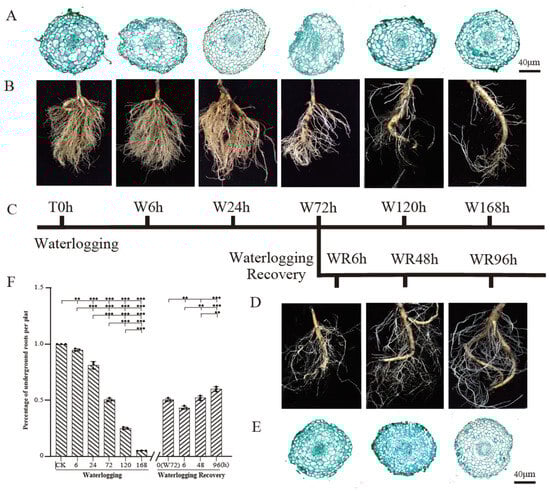 2.1. The Root Number and Root Tip Cell Morphology Underwent Significant Changes over the Course of the Waterlogging and Waterlogging Recovery Treatment