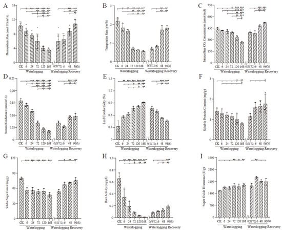 2.2. Nine Physiological and Biochemical Indicators Under Waterlogging Treatment and Recovery Conditions