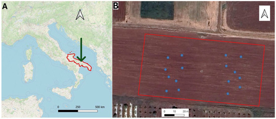 (A) Location of the experimental farm in Rutigliano (green arrow), Apulia region (red boundaries). (B) The cultivation area of cotton with the sampling points where stem water potential was determined (blue rings).