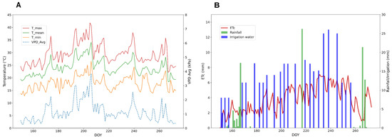 (A) The seasonal trend of average, maximum, and minimum temperatures, and vapor pressure deficit (VPD). (B) The seasonal trend of crop evapotranspiration (ETc), and the amount of rainfall and irrigation water applied.