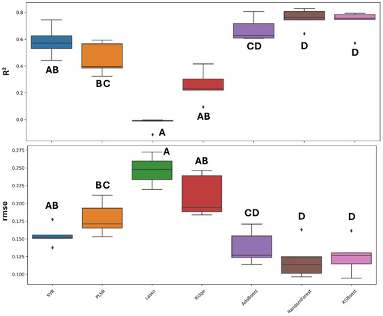 Modeling approaches compared in this study involved different machine learning algorithms: adaptive boosting (AdaBoost), support vector regressor (SVR), least absolute shrinkage and selection operator (Lasso), ridge regression (ridge) partial least square regression (PLSR), random forest (RF), and extreme gradient boosting (XGBoost). AdaBoost is an ensemble learning technique that combines multiple weak learners (i.e., decision trees) to enhance prediction; the central idea of AdaBoost is the iterative regulation of the weights of the training samples based on the errors of the previous models, thus focusing more on the hard-to-predict instances in subsequent iterations [37]. SVR is a popular machine learning technique used to solve regression problems by finding a hyperplane that minimizes the prediction errors; it is based on support vectors (the data points closest to the hyperplane) that are used to define the position and orientation of the hyperplane [38]. Lasso regression is a linear regression technique incorporating L1 regularization to improve the accuracy and interpretability of the model. Introduced by Robert Tibshirani [39], Lasso adds a penalty equal to the absolute value of the coefficients, promoting sparsity and reducing some coefficients to zero. This feature allows for efficient variable selection, making Lasso particularly useful in high-dimensional datasets where multicollinearity may be present [40]. Ridge regression is a regularization technique used to address multicollinearity in multiple regression models by adding a penalty to the loss function; this technique improves the estimation of coefficients by shrinking them towards zero, which reduces variance at the cost of introducing some bias, thereby enhancing the model’s performance [41,42]. PLSR is a multivariate method for modeling relationships between sets of observed variables when the predictors are highly collinear or when the number of predictors exceeds the number of observations. PLSR combines the characteristics of principal component analysis and multiple regression, allowing the extraction of latent variables that capture the most variance in the predictor variables and are also relevant to the prediction of the response variable [43,44]. RF is another supervised ensemble learning technique. RF improves regression by combining several decision trees to enhance the model’s performance and its generalization [35,45]. RF builds multiple randomized decision trees and averages the predictions of the single trees; this ensemble method improves the stability and accuracy of the model [46]. XGBoost is a highly efficient and scalable implementation of gradient boosting, a machine learning technique that combines predictions from multiple weak models (decision trees) to create a more powerful predictive model. Developed by Tianqi Chen and Carlos Guestrin [47], XGBoost has gained popularity for its performance and ability to handle large-scale data. XGBoost builds decision trees sequentially, and each tree is trained to correct the errors made by previous trees, focusing on the residuals of the predictions. This sequential training allows XGBoost to optimize the model iteratively, adjusting the predictions based on the performance of the ensemble as a whole [48,49].