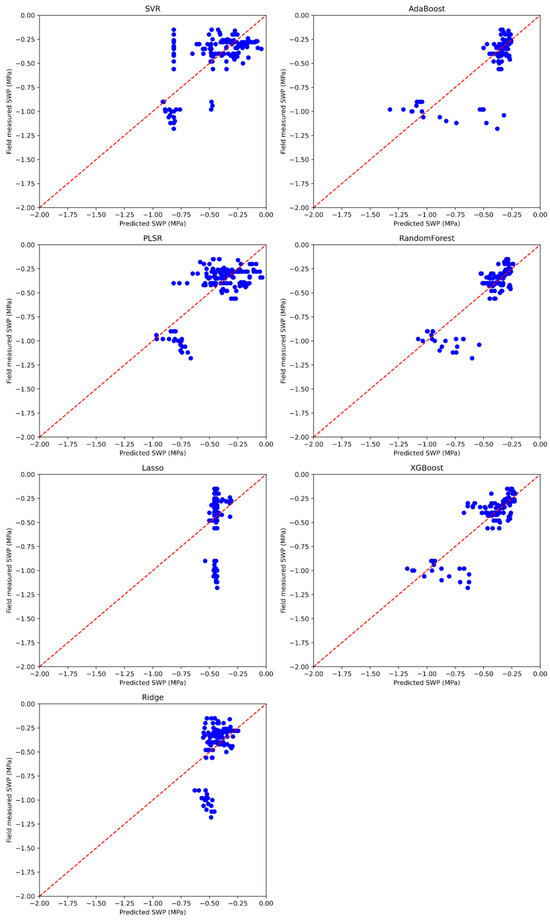 Scatterplots comparing field-measured and predicted stem water potential (SWP; MPa) of cotton for each machine learning model used in this study. The results are based on testing sets from five repeated random splits of the dataset (total: n = 144).