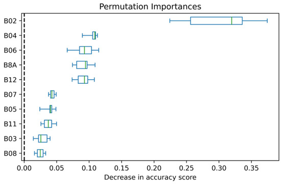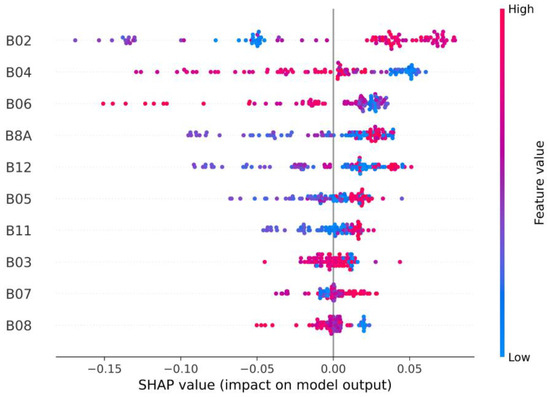 The permutation plot (Figure 5) shows that the most important S2-B for the prediction of cotton’s SWP using the RF-based model was B02 (blue region), followed by B04 (red), B06, and B8A (red edge regions). The least important for the prediction of SWP was B08. The SHAP method confirmed the importance of the same bands in this modeling approach (Figure 6); furthermore, the SHAP summary plot shows that higher values of B02 had a positive impact on the RF model’s outcomes. For B04 and B06, low and medium values had a positive impact on the model; in comparison, lower values had a negative impact. In the case of B8A, it seems that high and low values improved predictions, while medium values did not.