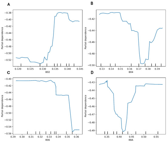 Partial dependence plot of the four most important Sentinel-2 spectral bands ((A) B02; (B) B04; (C) B06; (D) B8A) used as predictors with the random forest model.