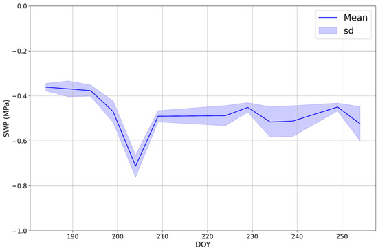 Table 2 reports the descriptive statistics of the SWP measured during the growing season, per DOY, and for the full dataset. The overall average SWP was −0.43 (±0.29) MPa, the median was −0.33 MPa, and the minimum and maximum values were −1.48 MPa and −0.15 MPa, respectively. The lowest mean values of SWP were detected on DOY 204 (−0.95 MPa). The Supplementary Materials (Table S1) report the descriptive statistics of the S2-Bs used as predictors in this study.