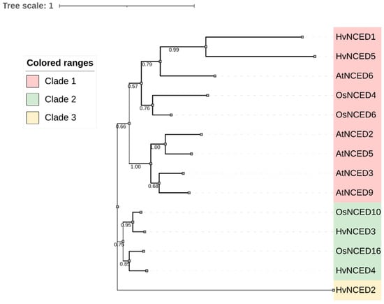 The phylogenetic study of NCEDs in A. thaliana, O. sativa, and H. vulgare revealed that the NCEDs were classified into three primary clades, as shown in Figure 1. Clade 1 consists of two subclades. The first subclade includes HvNCED1 and HvNCED5, which have a phylogenetic relationship with AtNCED6 from A. thaliana and OsNCED4 and OsNCED6 from O. sativa. The second subclade solely contains NCEDs from A. thaliana, specifically AtNCED2, AtNCED5, AtNCED3, and AtNCED9. The second clade consists of NCEDs from O. Sativa and H. vulgare, specifically OsNCED10 with HvNCED3 and OsNCED16 with HvNCED4. The third clade exclusively consists of HvNCED2.