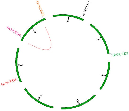 Chromosomal locations and gene duplication of the HvNCED gene family. The red line indicates the synteny between HvNCED3 and HvNCED4 genes.