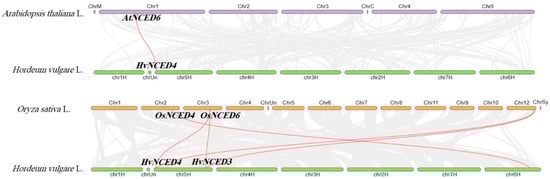 The synteny analysis of the NCED gene family members in three plant species: Arabidopsis thaliana, Oryza sativa, and Hordeum vulgare. The background of the image displays grey lines that show the synteny of the complete genome, whereas the red lines specifically demonstrate the synteny of the NCED genes.