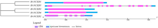 The HvNCED genes’ intron/exon structures are shown. Exons are represented by the pink boxes, introns by the black lines, and untranslated regions (UTRs) by the blue boxes.