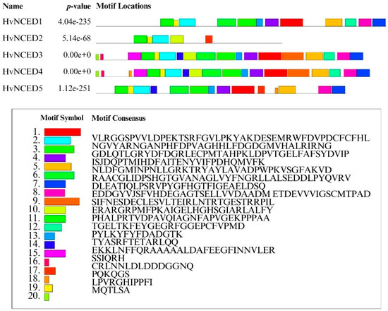 HvNCED protein’s conserved motifs. Different preserved motifs are represented by various colored boxes.