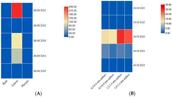 (A): Expression profile of HvNCEDs in different tissues of Hordeum vulgare (root, leaves, and flowers). (B): Expression profile of HvNCEDs in anthers at four specific time intervals (0.3–0.4 mm, 0.5–0.9 mm, 1.0–1.2 mm, 1.3–1.4 mm).
