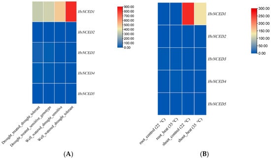 (A): Expression profile of HvNCEDs across drought-tolerant and drought-sensitive barley genotypes. (B): Expression profile of HvNCEDs across control (22 °C) and heat-stressed barley plants (35 °C).