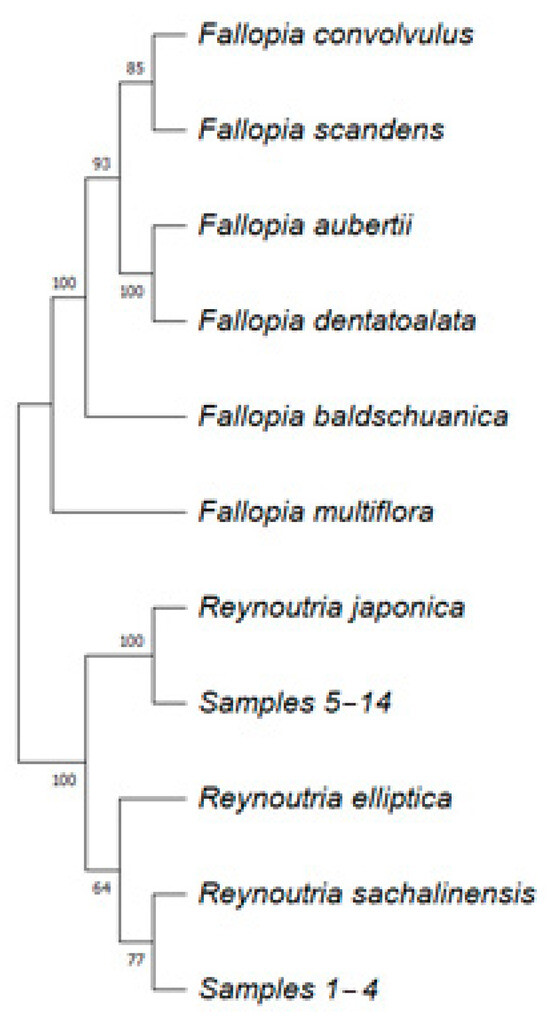 Phylogenetic tree generated by based on maximum likelihood analysis of genes (ITS2, matK, and rps16). Bootstrap support values (≥50%). Samples 1–4 (collected in Sakhalin Oblast, Russia) and samples 5–14 (collected in Primorsky Krai, Russia).