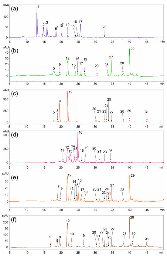Comparison of HPLC-UV chromatographic profiles (310 nm) for the methanolic extracts leaves (a), stems (b), and roots (c) of plants Reynoutria japonica and leaves (d), stems (e), and roots (f) of plants Reynoutria sachalinensis. 1—chlorogenic acid; 2*—coumaroyl quinic acid; 3—5-O-caffeoylquinic acid; 4—procyanidin dimer, type B; 5—epicatechin; 6*—coumaroyl quinic acid; 7—catechin; 8—piceatannol 3′-O-glucoside; 9—resveratroloside; 10*—coumaroyl quinic acid; 11—luteolin 7-O-glucoside; 12—trans-polydatin; 13—epicatechin-3-gallate; 14—quercetin-3-O-glucoside; 15—quercetin-3-O-pentoside; 16—quercitrin; 17—quercetin-3-O-pentoside; 18—cis-polydatin; 19—kaempferol-3-O-glucoside; 20—resveratrol; 21—quercetin; 22—torachrysone glucoside; 23—emodin glucoside; 24—emodin-8-O-(6′-O-malonyl)-d-glucoside; 25—hydropiperoside; 26—physcion-8-O-β-d-glucoside; 27—torachrysone; 28—vanicoside C; 29—vanicoside B; 30—questin; 31—emodin. *—Asterisk indicates isomer.