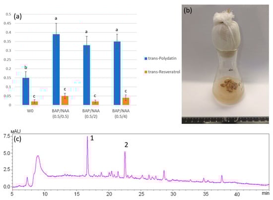(a) Trans-polydatin and trans-resveratrol content in Reynoutria japonica cell culture. (b) Photograph of one-month-old Reynoutria japonica cell culture. (c) HPLC-UV chromatographic profiles (310 nm) of Reynoutria japonica cell culture. 1—trans-polydatin; 2—trans-resveratrol. Means on each column followed by the same letter were not different using ANOVA with Tukey’s pairwise comparisons.