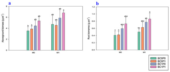 Effect of phosphorous (P), phosphorous-solubilizing bacteria (PSB), and biochar (BC) on the (a) root and (b) shoot dry biomass of maize grown in cadmium (Cd; 20 mg kg−1)-contaminated soil. Note: BC0 (control), BC1 (biochar; 5% w/w biochar), P0 (0 g kg−1 phosphorous), P1 (0.8 g kg−1 phosphorous), M0 (0 g kg−1 of Bacillus megaterium), and M1 (10 g kg−1 of Bacillus megaterium).