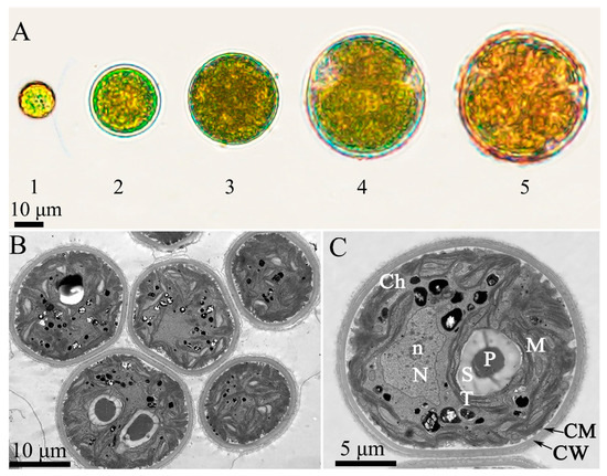 Morphological study of the new strain Dysmorphococcus globosus ZY24. (A) Morphological changes during growth of the microalga D. globosus. (A1) A motile cell under vegetative growth conditions (first day); (A2) initially immotile cell under vegetative growth conditions (second day); (A3) medium-term immotile cell under vegetative growth conditions (third day); (A4) mature cell under vegetative growth conditions (fifth day); (A5) immotile cell under inductive growth conditions (seventh day); (B,C) TEM images of ZY24. Ch: chloroplast; CM: cell membrane; CW: cell wall; M: mitochondria; N: nucleus; n: nucleolus; P: pyrenoid; S: starch; T: thylakoids.