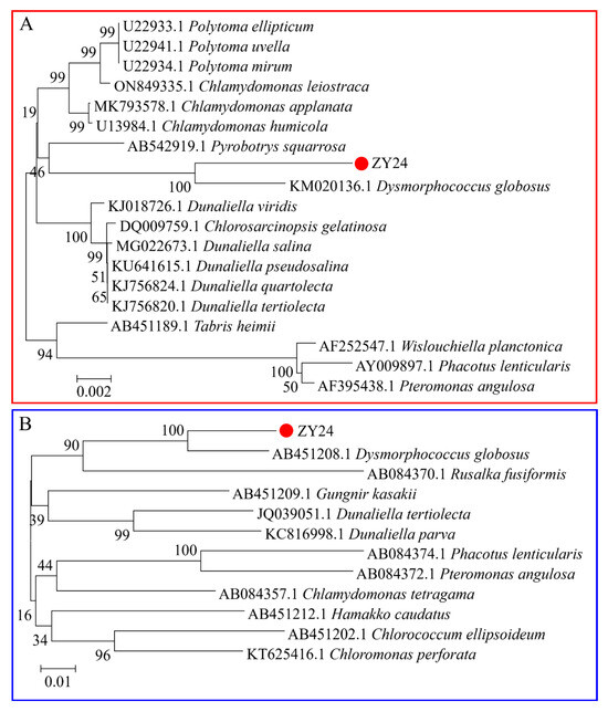 Morphological characteristics of the isolated microalgae were observed under a light microscope (IX73P2F, Olympus, Tokyo, Japan). The experimental strain was a unicellular dark-green microalga, with most cells in an aggregated state. The cells illustrated in Figure 1A were 10–40 µm in size. The diameter of the young green cells was approximately 10 mm, and the common cell size at maturity was approximately 40 mm. Under suitable culture conditions, microalgae had two flagella in their motile form in the green vegetative cell stage. When cells suffer from nutrient starvation or environmental stress factors, the colour of some of them changed from green to orange-red, which could indicate the accumulation of carotenoids. Further observations were performed using transmission electron microscopy (TEM; JEOL, JEM-1400-FLASH, Tokyo, Japan), and the main structures are shown in Figure 1B, C. An oblique section through a D. globosus ZY24 cell shows that one to two large pyrenoids were present, surrounded by a homogeneous starch sheet and thylakoids from both ends and on all sides. The cells had thick cell walls and were surrounded by a cell membrane. Chloroplasts occupied most of the cell volume. The mitochondria were present in the cytoplasm. The oblique section also showed the nucleus and nucleolus. Neighbour-joining tree clustering clearly showed the genetic relationships of strain ZY24 within the genus Dysmorphococcus (Figure 2). The 18S rRNA and psaB sequences showed similarity of the newly isolated strain with the sequenced strain of D. globosus (SAG 20-1) according to reference sequences of 18S rRNA (KM020136.1) and psaB (AB451208.1). The NCBI accession numbers for this algal strain’s gene sequences of 18S rRNA and psaB are PQ002471 and PQ046780, respectively. The structure of D. globosus cells observed under the microscope was similar to that of D. globosus-HI cells [36]. Our algal strain was named D. globosus ZY24.