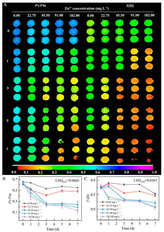Changes in chlorophyll fluorescence parameters in microalgal Dysmorphococcus globosus strain ZY24 cultivated in the presence of different concentrations of Zn2+ over 7 days. (A–C) show the phenotype, maximum quantum efficiency, and actual quantum yield of PS II photochemistry, respectively. Each data point represents the meaning of three replicates; error bars indicate the standard error of the mean. The statistical significance of the difference between the means was analysed using Duncan’s Least Significant Difference (LSD) test. Fv/Fm is associated with the maximum photochemical quantum yield of PSII; Y(II) is an important parameter for measuring the efficiency of converting light energy to chemical energy in plant photosynthesis.