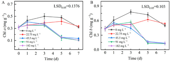 Chlorophyll is one of the most critical pigments in the majority of photosynthesising organisms because it allows algae and plants to absorb the electromagnetic energy of light and convert it into chemical energy stored in covalent bonds [43]. The chlorophyll content in microalgal cells varies depending on the environmental factors. The effects of Zn2+ on chlorophyll a and b contents in ZY24 microalgae are shown in Figure 6. The contents of both types of chlorophyll decreased in a concentration-dependent manner when microalgae were cultivated in Zn2+-supplemented media. Thus, the chlorophyll content was significantly reduced at Zn2⁺ concentrations higher than 45.5 mg L−1 beginning on day 3 after treatment initiation, presumably owing to the cytotoxic effects of high Zn2+ levels.