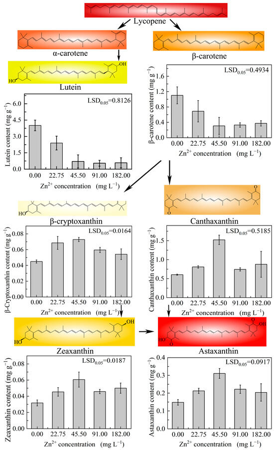 Other microalgae, such as Chlorella vulgaris and D. salina, are potential additional sources of carotenoids. Further, several species of microalgae, such as D. salina, A. platensis, and some diatoms, are good sources of β-carotene, lutein, canthaxanthin, and astaxanthin [44]. In this study, high Zn2+-induced stress promoted pigment formation in strain ZY24, such that astaxanthin, zeaxanthin, β-cryptoxanthin, and canthaxanthin contents significantly increased in microalgae cultivated in the presence of 45.5 mg L−1 Zn2+, reaching values of 0.311, 0.061, 0.073, and 1.522 mg g−1, respectively (Figure 7). However, contents of all these pigments began to decrease at Zn2+ concentrations greater than 91 mg L−1. Indeed, excessively high Zn2+ concentrations reduced pigment production and ultimately caused cell death. In particular, β-carotene and lutein contents were inversely proportional to Zn2+ concentrations, likely because Zn2+ stress caused inhibition of pigment synthesis concomitant with the conversion of existing β-carotene to canthaxanthin and zeaxanthin, and ultimately, of zeaxanthin to astaxanthin [45]. Chekanov et al. showed that astaxanthin and β-carotene were the predominant pigments in the cells of the new microalgal strain Bracteacoccus aggregatus, BM5/15, comprising 48% and 13%, respectively [46]. In contrast, the main pigments in D. globosus strain ZY24 were canthaxanthin, astaxanthin, and β-carotene, present in ratios of 51%, 10%, and 10%, respectively. The fractions of astaxanthin and β-carotene were high in these algal species. Biotechnological approaches may be employed to enhance their astaxanthin content.