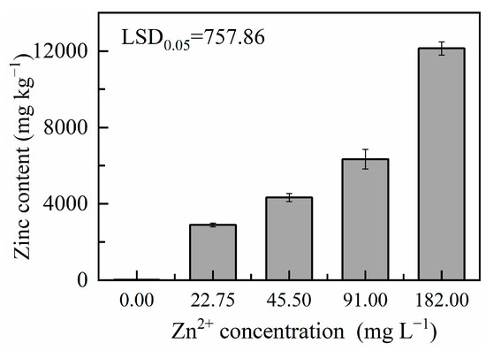 Zn2+ accumulation in Dysmorphococcus globosus strain ZY24 harvested at various initial Zn2+ concentrations in the growth medium. Each data point represents the mean of three replicates; error bars indicate the standard error of the mean. The statistical significance of the difference between the means was analysed using Duncan’s Least Significant Difference (LSD) test.